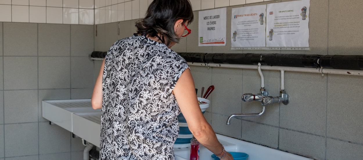 Sanitary block with showers, toilets, washbasins, dishwashing areas, baby changing area, and facilities for people with reduced mobility.